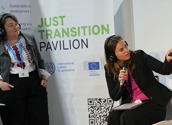 Zwei Fahrradfahrende in Winterjacken auf winterlicher Straße mit geräumtem Schnee an der Seite