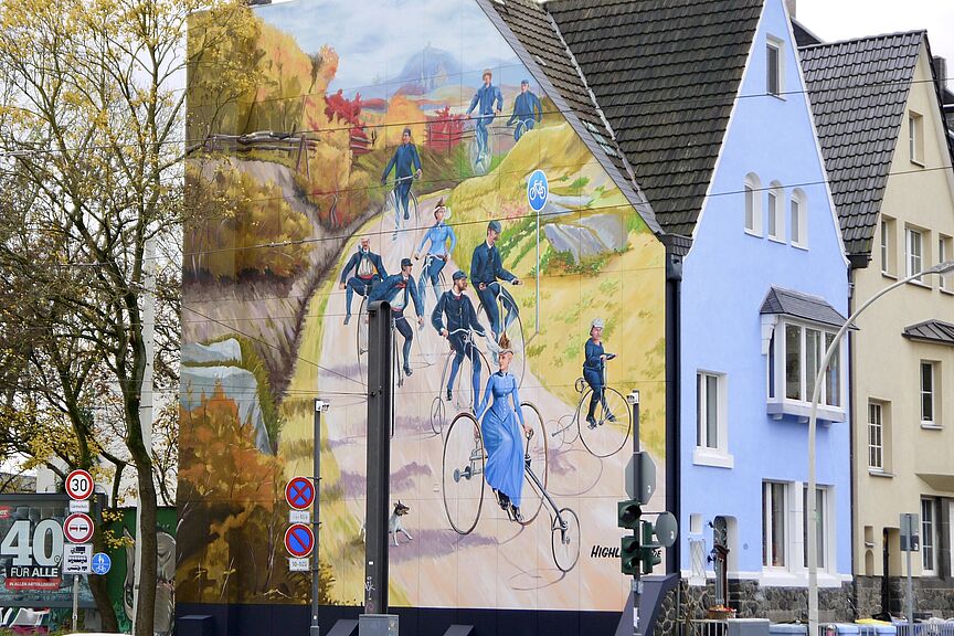 Die Neubürgertouren starten immer am 1. Samstag im Monat um 14 Uhr auf der Schlossweiherbrücke vor dem Poppelsdorfer Schloss. Zur Premiere am 5. April wird Tourenleiterin Gabriele Heix den Teilnehmern besondere Streetart-Projekte in Bonn vorstellen. Das Fahrrad ist dafür ganz ideal, beispielsweise um die großflächige Gestaltung einer kompletten Hauswand mit der Szene eines nostalgischen Fahrradausfluges um die Jahrhundertwende in der Südstadt zu genießen.